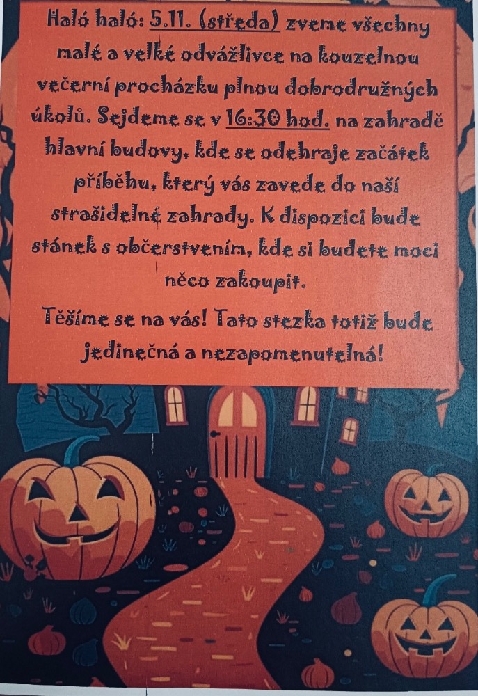 5.11. zveme všechny odvážlivce na kouzelnou večerní procházku plnou dobrodružných úkolů. Sejdeme se v 16:30 hod. na zahradě hlavní budovy (ředitelna). K dispozici bude i stánek s občerstvením. Kostýmy jsou vítány. Více info viz příloha. Těšíme se na Vás! Číst více